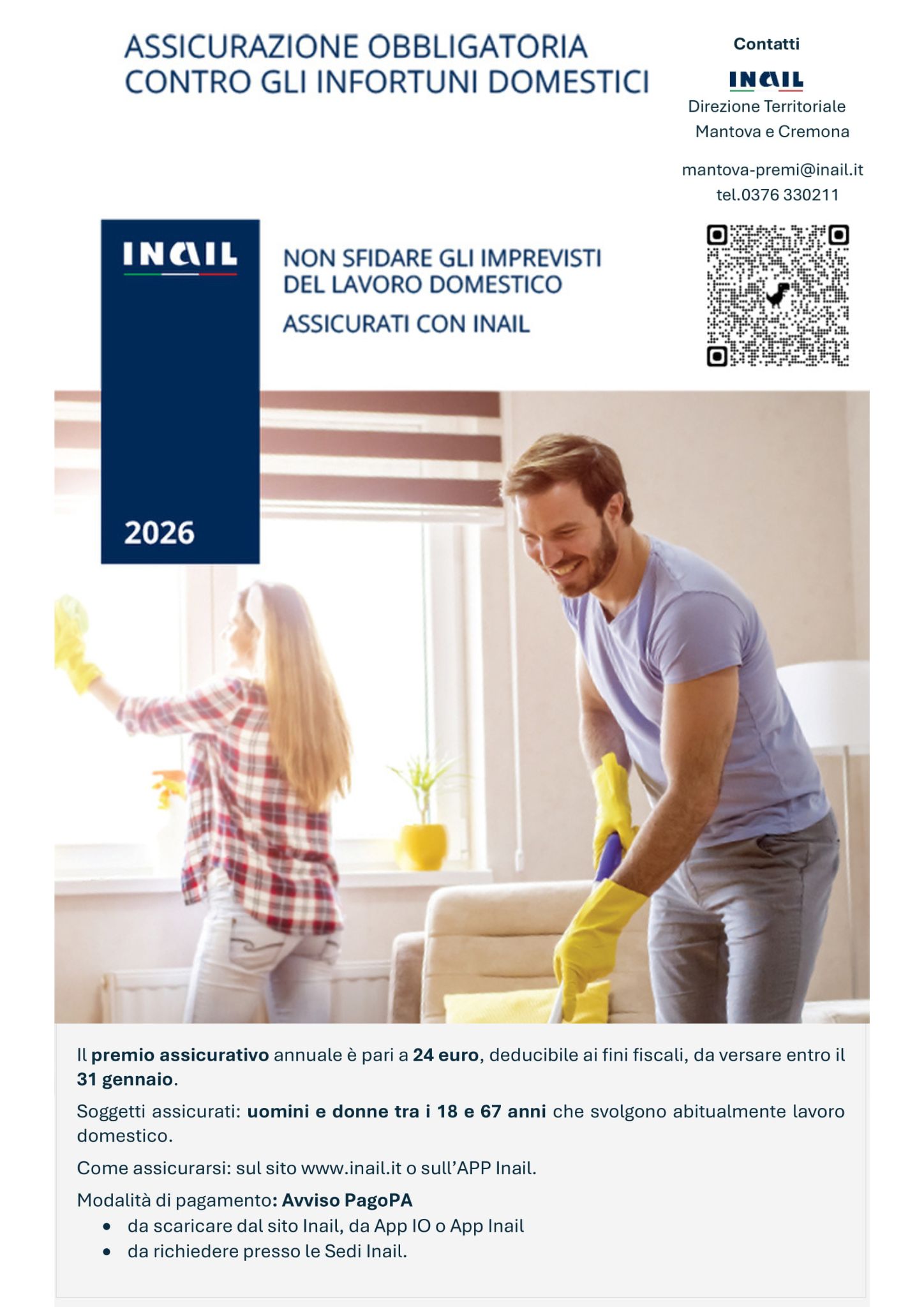 Dallo scorso 1° gennaio è possibile, infatti, procedere al pagamento, fino al 31 gennaio 2026, dell’assicurazione per accedere alle forme di tutela messe a disposizione dall’INAIL per le persone di età compresa tra i 18 ed i 67 anni e che si occupano dei lavori in casa e della cura dei familiari in maniera abituale, gratuita ed esclusiva.