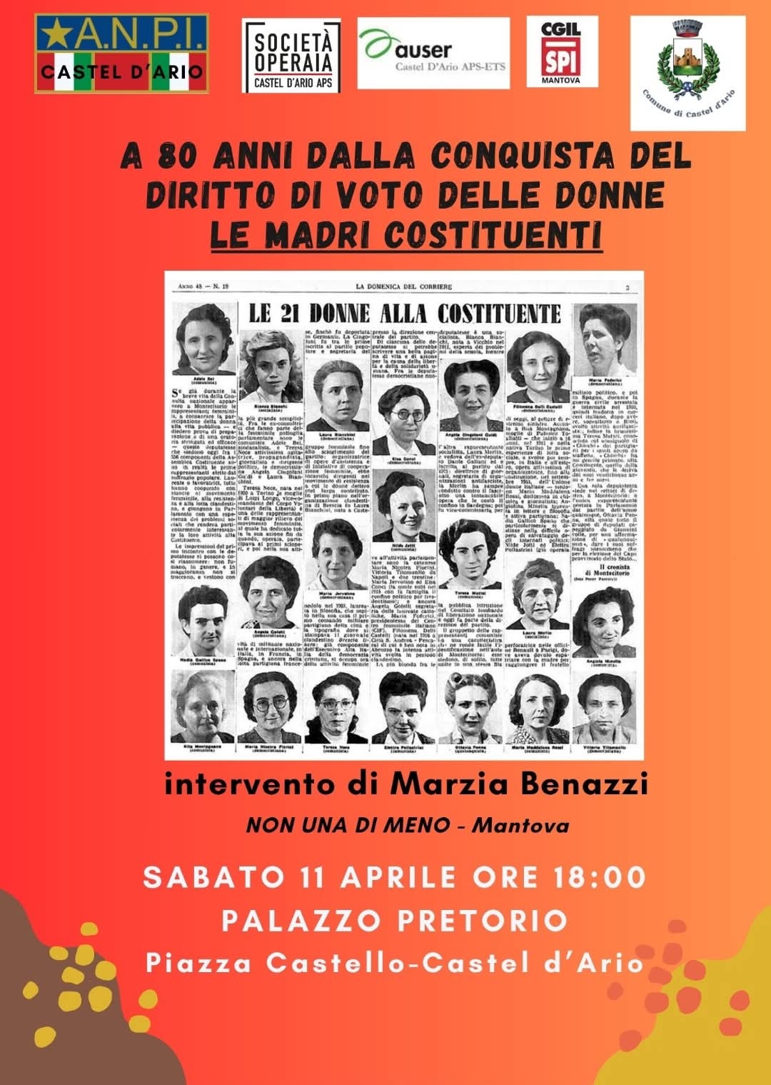 A 80 anni dalla conquista del diritto di voto delle donne, ANPI Castel d'Ario, in collaborazione con la Società Operaia APS, AUSER Castel d'Ario e con il patrocinio del Comune di Castel d'Ario, propone un incontro dal titolo Le madri costituenti.